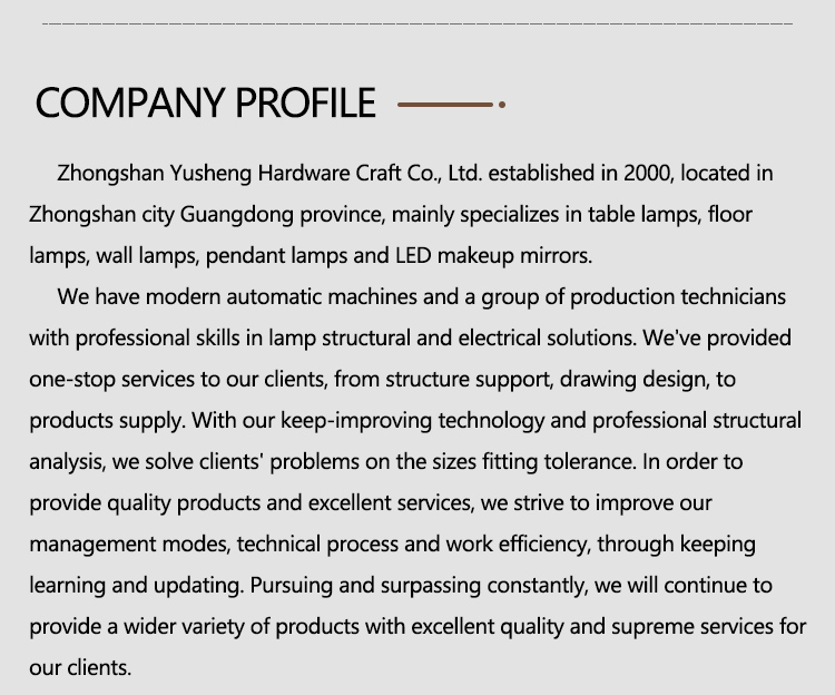 中山市誉盛五金工艺有限公司成立于2000年,前身为“盛世照明配件厂”。公司主要生产照明五金配件、化妆镜、伸缩管、伸缩接头、金属摇臂、台灯、落地灯配件及各种灯管产品等五金制品,并为客户提供结构设计和生产服务。
